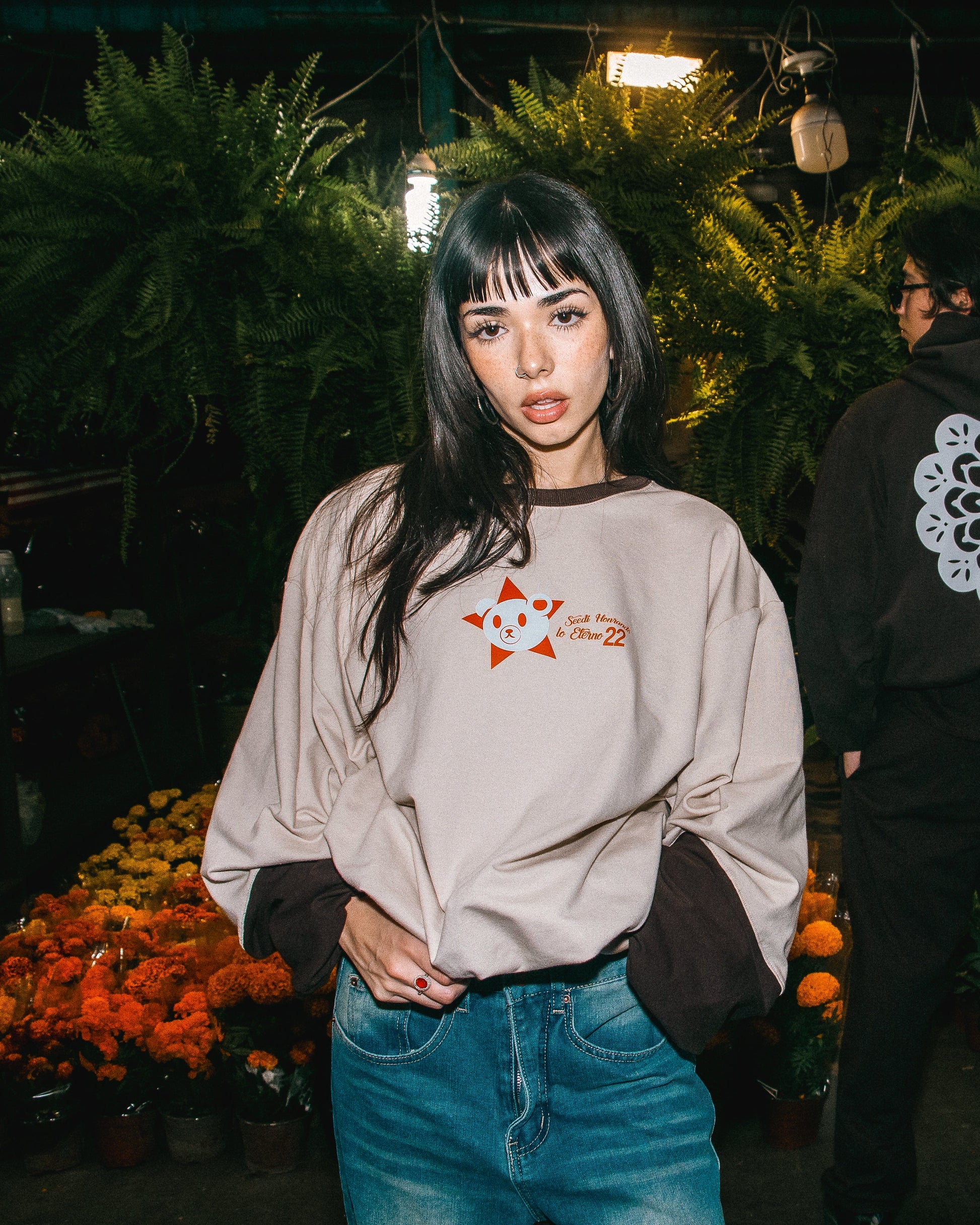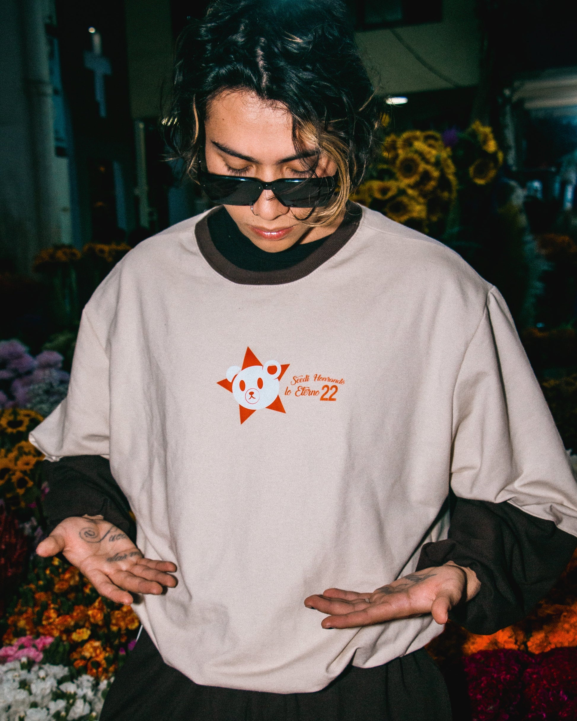 Suéter confeccionado en french terry de algodón con textura firme y tacto suave. El contraste entre el beige cálido y el marrón profundo resalta su estructura minimalista y corte cropped elástico. El gráfico central “Seedi Honrando lo Eterno 22” aporta un guiño simbólico al paso del tiempo, fusionando nostalgia y modernidad en una pieza diseñada para trascender tendencias.